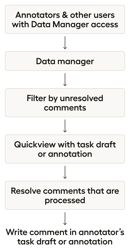 The following two workflows are flexible and can be combined. For example, in Figure 1A, Annotators don’t have access to the Data Manager and they would only use the Label Stream. They can write comments there, resolve them, and see notifications. Meanwhile, other roles like Managers or Administrators can filter tasks by “Unresolved comments” in the Data Manager and use the second workflow (see Figure 1B).