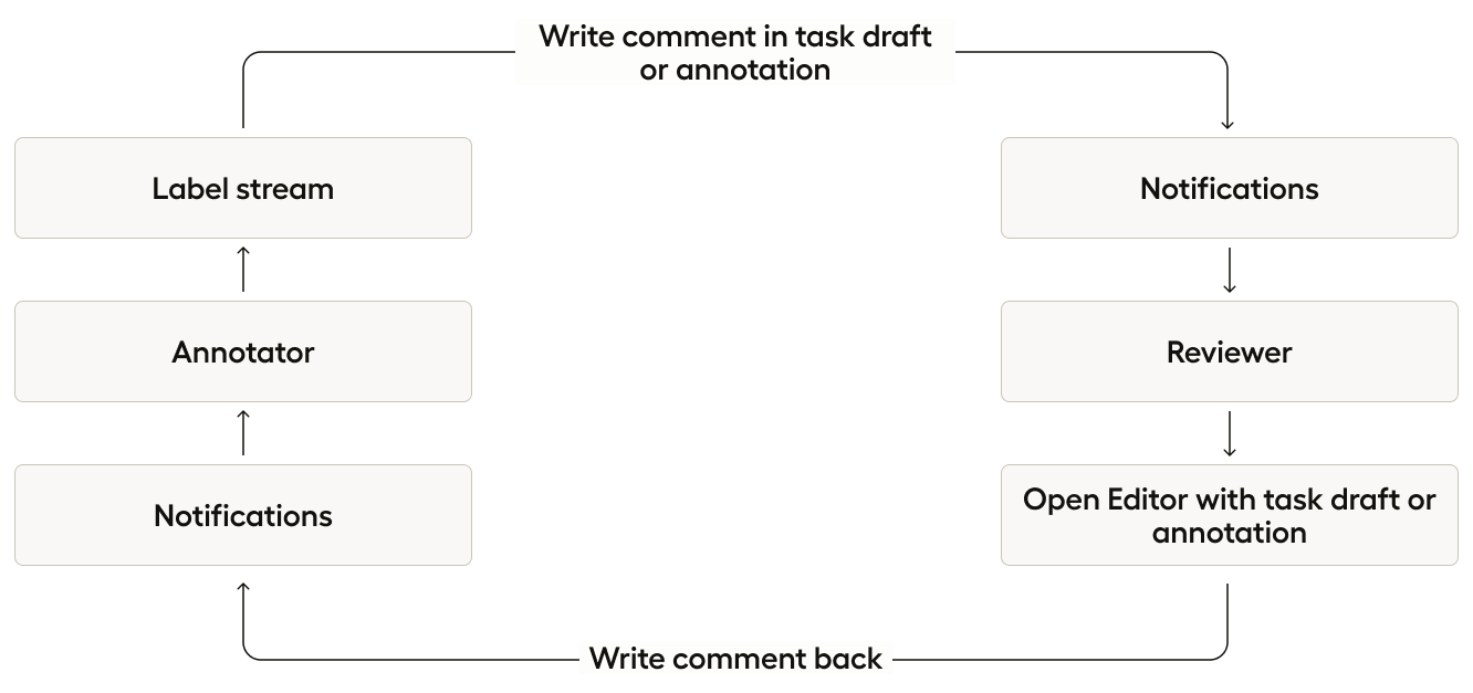 Users can discuss task issues and other problems during labeling and reviewing processes using Comments and Notifications in Label Studio Enterprise.