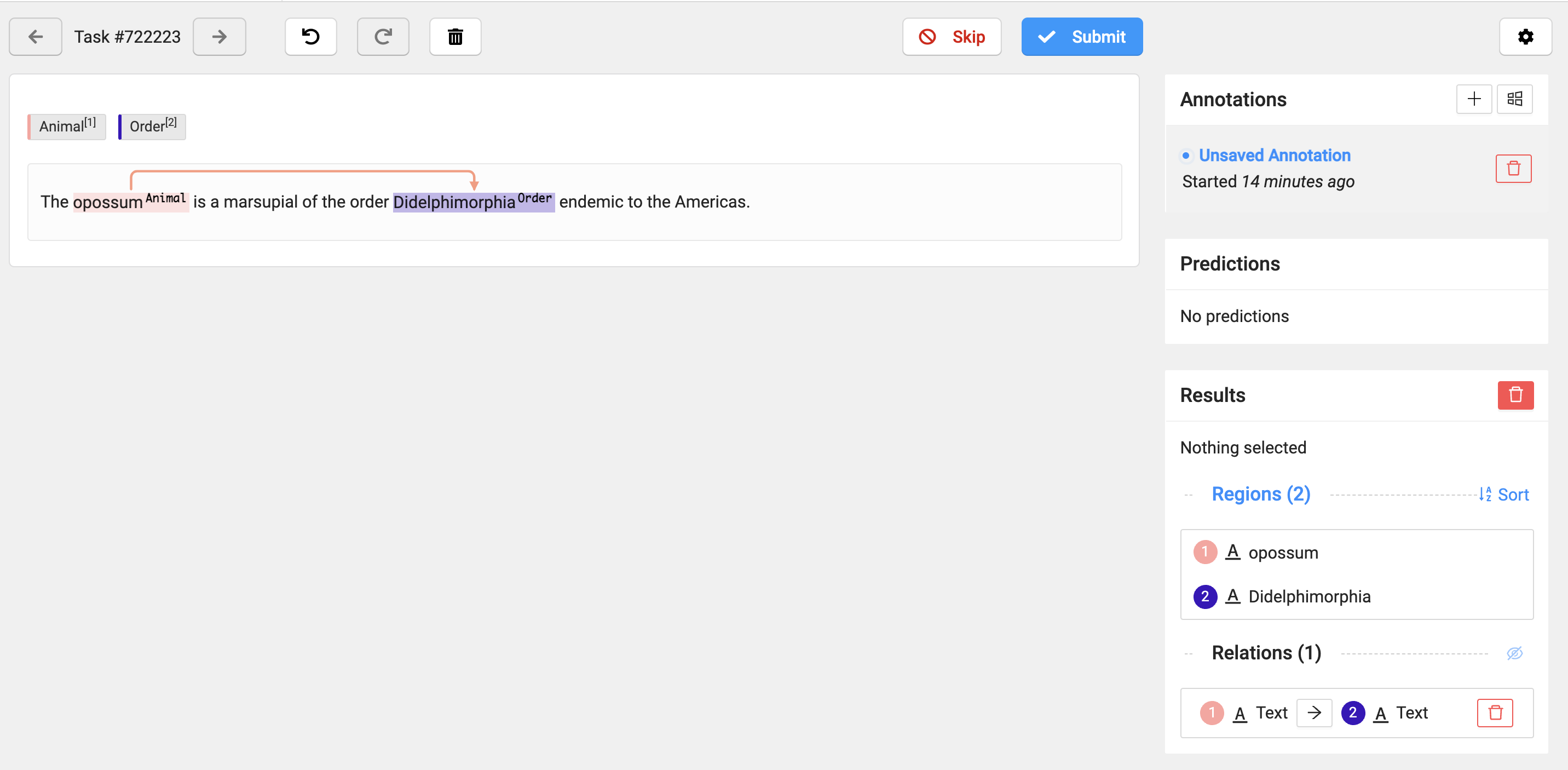 - To add labels to the direction arrow indicating the relation between two annotations, click the vertical ellipsis button next to the two related regions to add your predefined labels. You must have a label configuration that includes relations to do this.