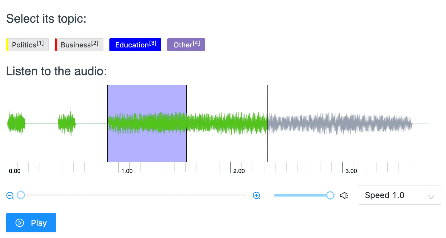 The choice="multiple" argument allows one audio segment to be labeled with multiple topics.